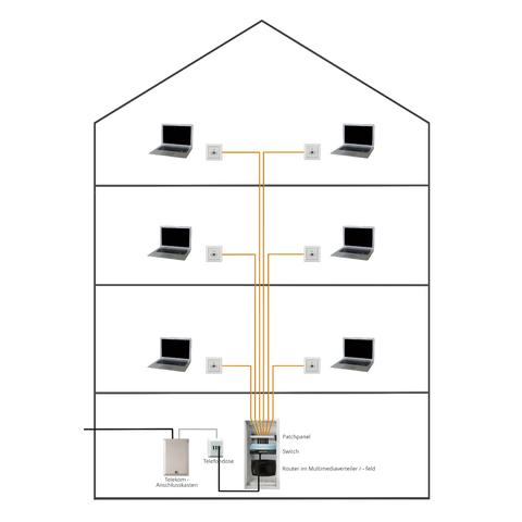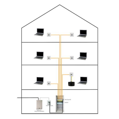 Beim Aufbau einer Netzwerkanlage macht es Sinn, einen zentralen Punkt zu wählen, von dem aus alle Netzwerkkabel sternförmig in die entsprechenden Räume zu ziehen sind.