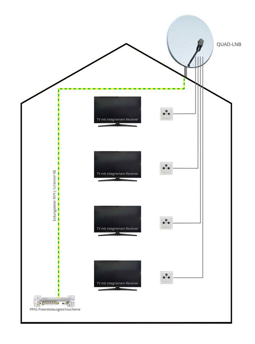 Bezüglich der Erdung ist es notwendig, dass eine Sat-Anlage auf dem Dach oder an der Wand, die einen bestimmten Winkel vom höchsten Punkt des Hauses durchbricht und somit einen hohen Punkt am Haus darstellt (Skizze folgt), einen Potentialausgleich anzuschließen. Dieses wird mit mind. 16 qmm massiver Kupferleitung ausgeführt, oder falls vorhanden, in die Blitzschutzanlage des Hauses zu integrieren. Ist die Anlage in einem bestimmten Dachwinkel an der Hauswand befestigt muss sie mit einer mind. 4qmm Leitung gegen atmosphärischer Spannung geerdet werden. Die Erdungsleitungen müssen bis zum Potentialausgleich am Haus auf kürzestem Wege geführt werden. Des Weiteren müssen alle Koax-Leitungen, die in das Gebäude eindringen, ebenfalls wie der Multischalter, geerdet werden.