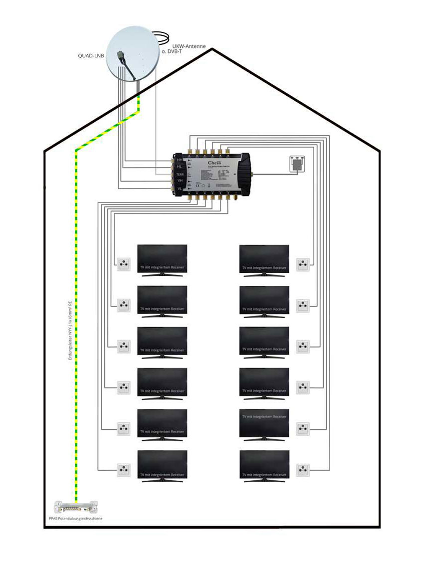 Weiterhin muss vorher festgestellt werden, wie viele Endgeräte angeschlossen werden sollen. Von jedem Fernsehgerät muss ein einzelnes Kabel direkt zum Multischalter (Umschaltmatrix) gelegt werden, welches die vier einzelnen Ebenen