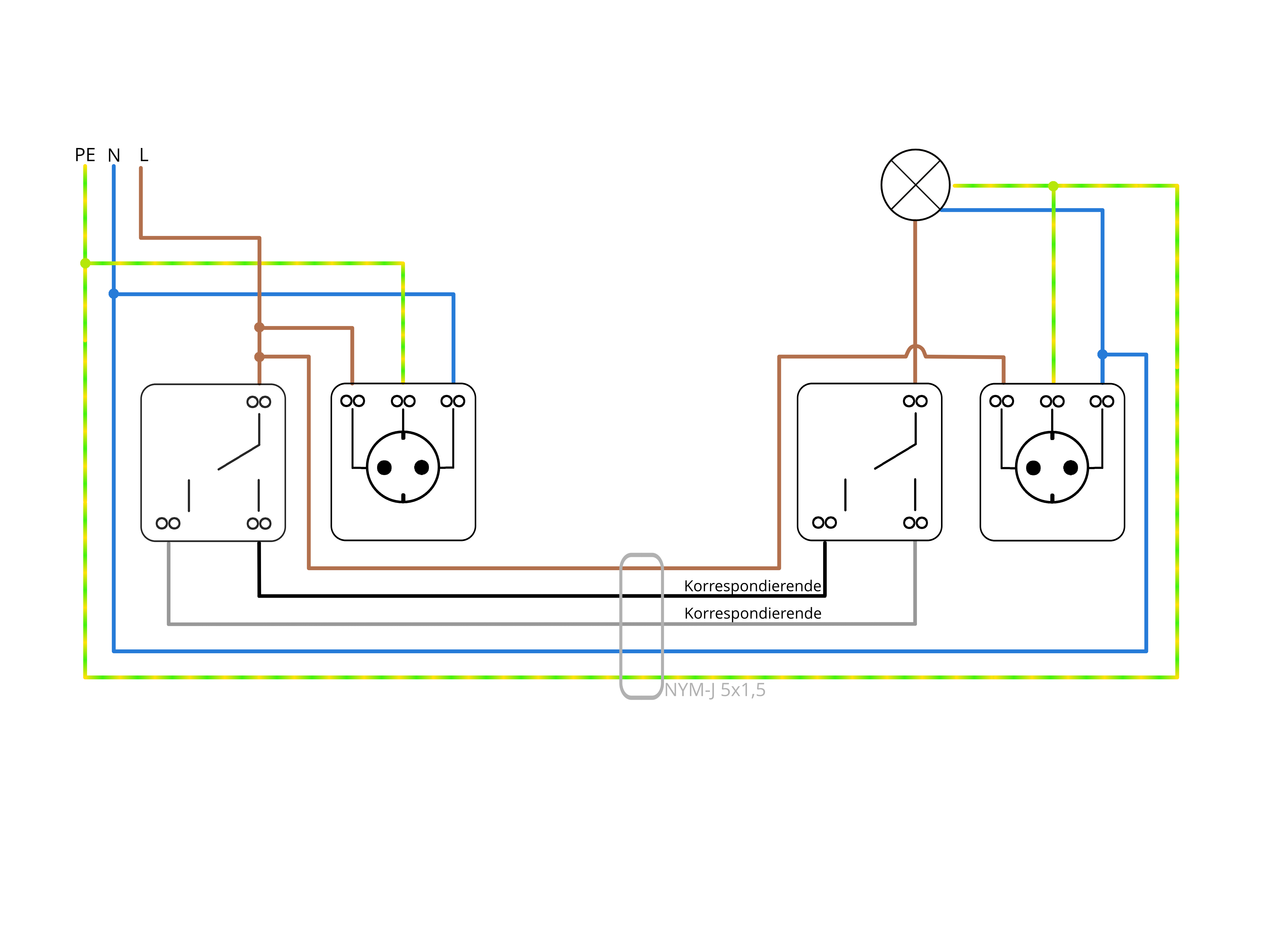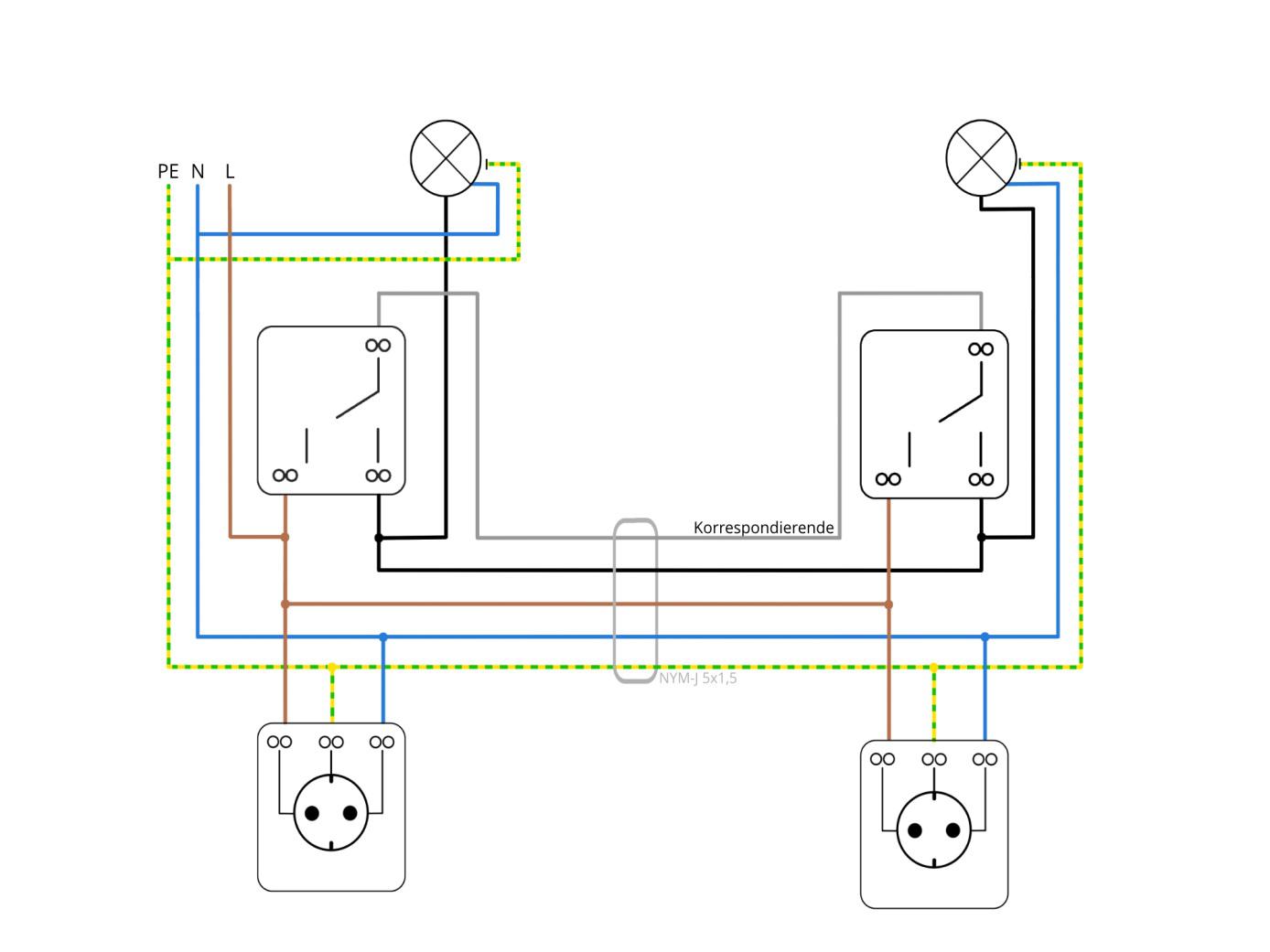 Wer zusätzlich noch eine Steckdose in den Stromkreis mit aufnehmen möchte, kann die benötigten Abzweigungen auf der Seite der Zuleitungen des ersten Wechselschalters anbringen. Dazu einfach den braunen, blauen und grün-gelben Draht parallel für die Steckdose verwenden.